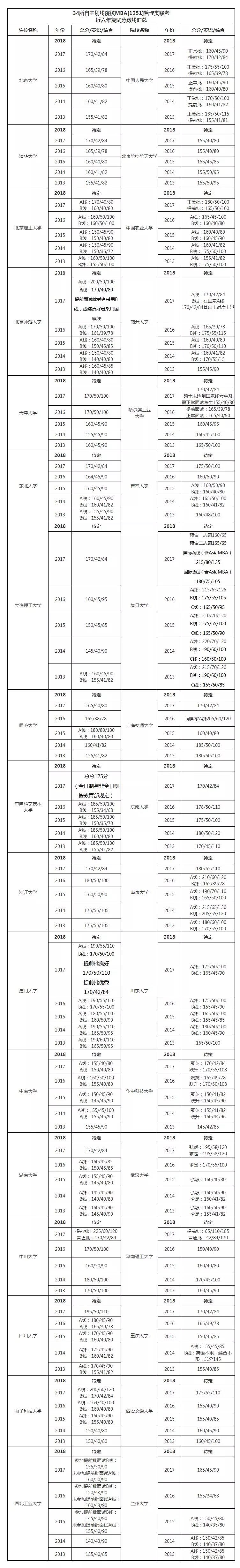 秘籍一:34所自主劃線院校MBA管理類聯考近六年復試分數線匯總