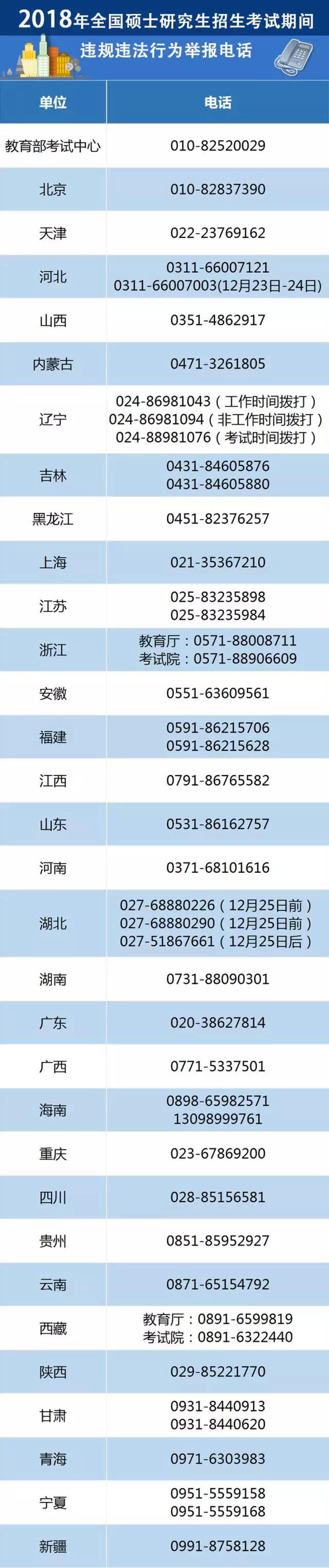 2018年全國碩士研究生招生考試將于2017年12月23日-25日舉行。為嚴厲打擊涉考違法活動,嚴肅考試紀律,維護考生合法權益,確保考試公平公正,教育部公布2018年全國碩士研究生招生考試期間違規違法行為舉報電話。