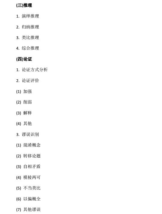 4、論證:這一部分主要包括如下三方面內容:(1)論證方式的分析;(2).論證的評價;(3)邏輯謬誤的識別。