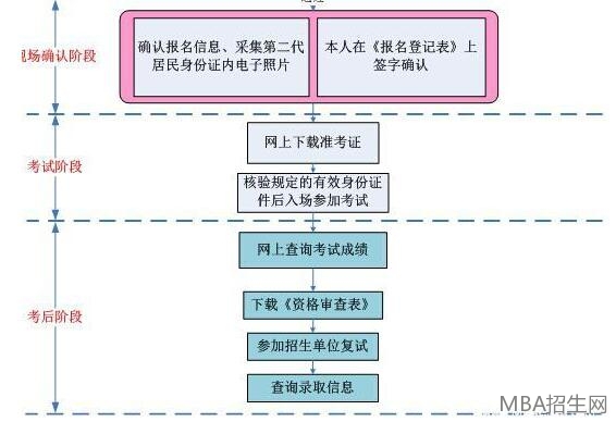MBA報考流程包括網上報名和現場確認兩個階段。應屆本科畢業(yè)生原則上應選擇就讀學校所在省(區(qū)、市)的報考點辦理網上報名和現場確認手續(xù)。其考生應選擇工作或戶口所在地省(區(qū)、市)的報考點辦理網上報名和現場確認手續(xù)。