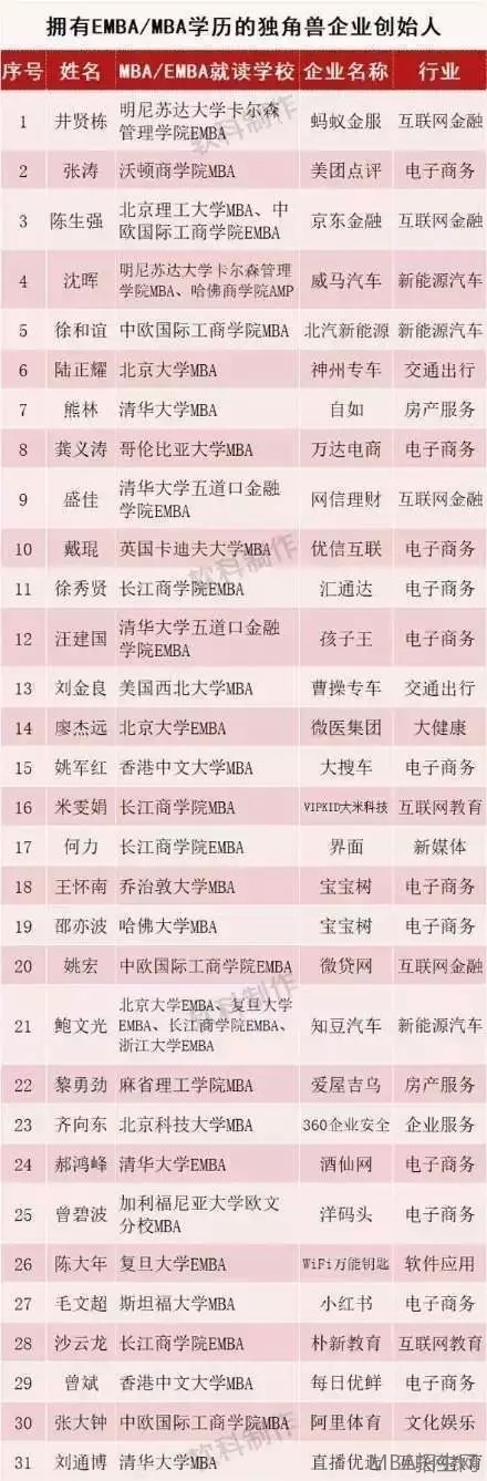 獨角獸創始人中很多擁有EMBA/MBA學歷,在他們打造自己的商業帝國的過程中,MBA/EMBA商學院為他們提供了更多的資源、管理知識、商業思維和視野,為事業的快速發展打下了堅實的基礎。