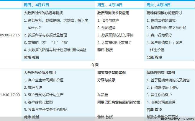 另外,我們還將邀請阿里巴巴商業(yè)智能部(BI)副總裁前來分享精確營銷的實踐案例,幫助學(xué)員理解以大數(shù)據(jù)和技術(shù)驅(qū)動的最新營銷策略和實用技術(shù)。