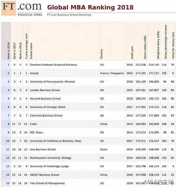 1月29日,英國(guó)《金融時(shí)報(bào)》( Financial Times )發(fā)布“全球MBA百?gòu)?qiáng)榜”( Global MBA Ranking 2018 ),斯坦福商學(xué)院、INSEAD、沃頓商學(xué)院摘得前三甲。 進(jìn)入排行榜的中國(guó)學(xué)校共有7所,分別為今中歐國(guó)際工商學(xué)院、香港科技大學(xué)商學(xué)院、香港大學(xué)、上海交通大學(xué)安泰經(jīng)管學(xué)院、復(fù)旦大學(xué)管理學(xué)院、中國(guó)人民大學(xué)商學(xué)院、香港中文大學(xué)商學(xué)院。