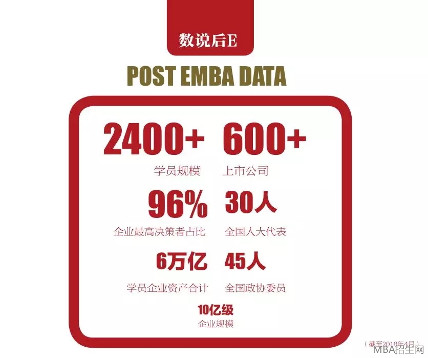 后EMBA商業領袖項目開辦6年以來,已成為中國企業家高端知識學習和資源整合平臺。截止2017年5月,已實現學員規模2100人+,上市公司600+,企業最高決策者占比96%,學員企業資產合計6萬億,全國政協委員45人,全國人大代表30人。