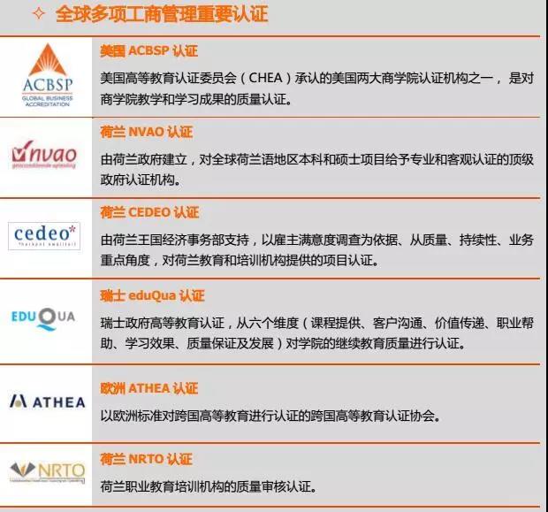 BSN 荷蘭商學(xué)院擁有美國(guó) ACBSP、荷蘭 NVAO、瑞士 eduQua、歐洲 ATHEA 等多項(xiàng)全球工商管理重要認(rèn)證;2016 年 2 月,被英國(guó)著名《CEO》雜志評(píng)選為歐洲一流工商管理學(xué)位項(xiàng)目。